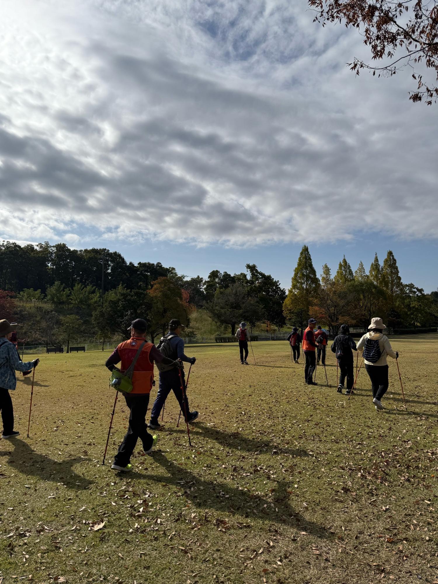 全日本ノルディックウォーク連盟公認指導員の指導のもと、参加者11名が2コースに分かれ園内を歩きました。