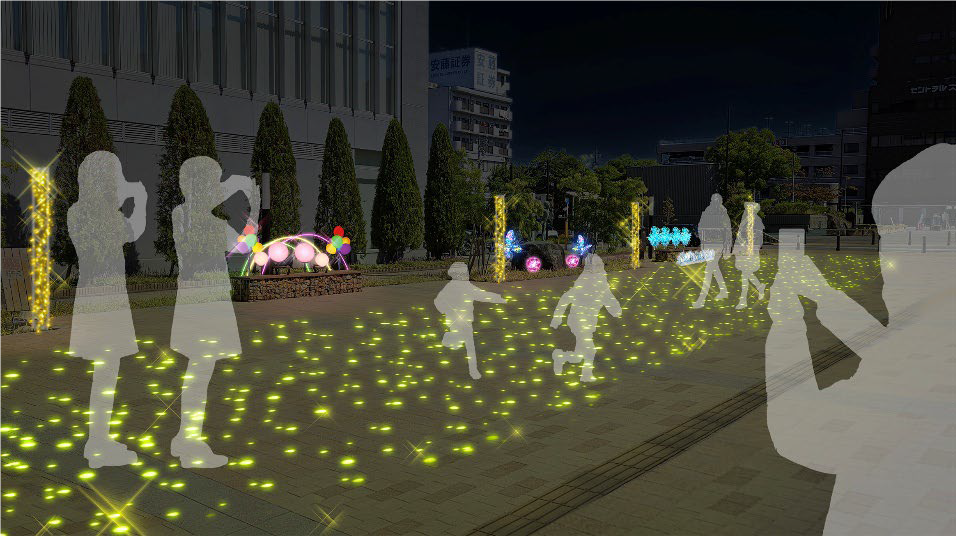 図書館前エリアの地面にはゆっくり動くホタルのような優しい光を投影します。いつもより神秘的な道をゆったり歩いてみてはいかがでしょうか。お子さまも喜ぶこと間違いなし!