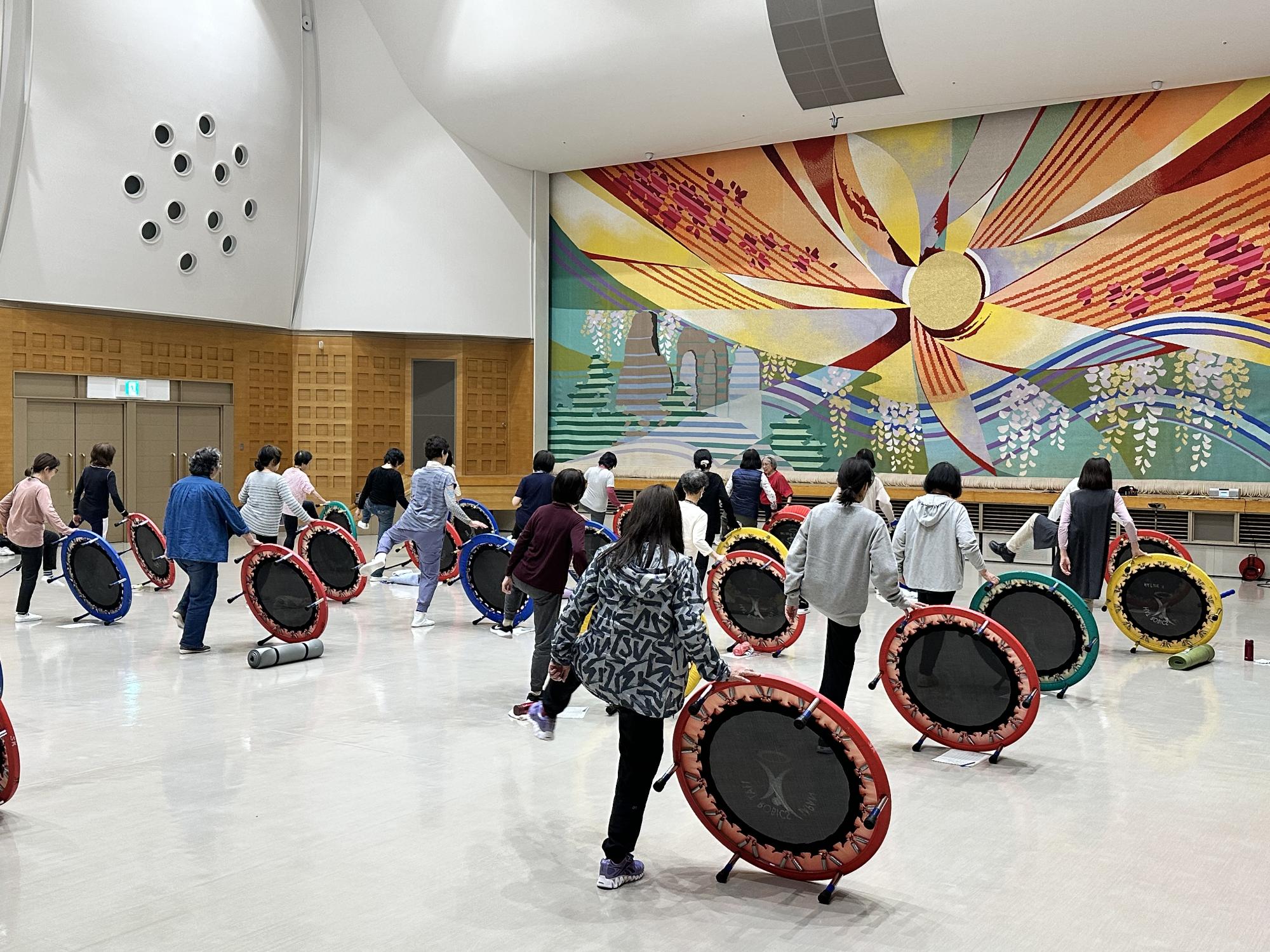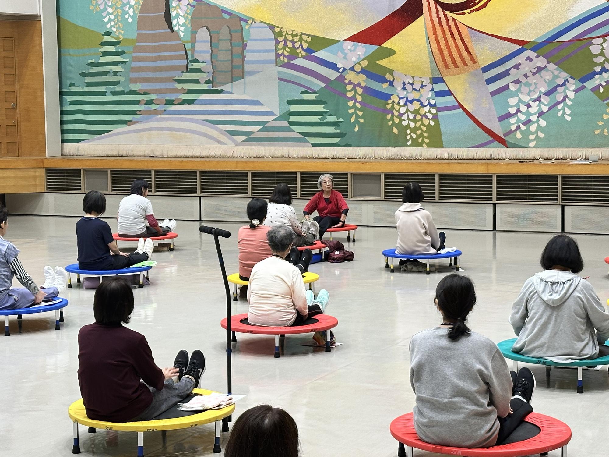 後期市民企画講座「ミニトランポリンで歩こう」が始まりました。講師は小牧市ミニトランポリン協会副会長の香月諭子先生です。初回の講座では、ミニトランポリンを実際に歩いてみて地上との違いや、その効果などについて学びました。今後はより具体的にミニトランポリンを使った運動を学ぶ予定です。