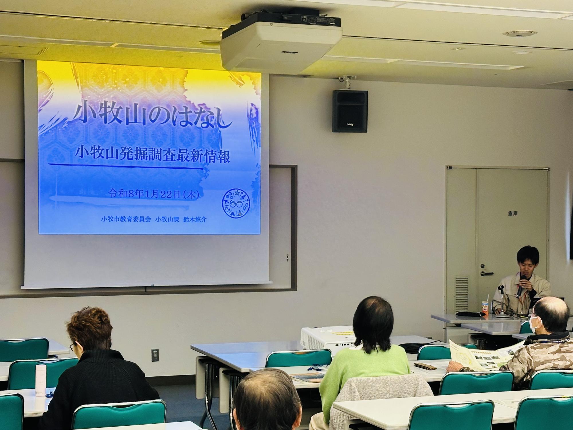 第17回目の講師は、小牧市教育委員会小牧山課の鈴木様をお迎えし、「小牧山のはなし 小牧山発掘調査最新情報」というテーマで講義をしていただきました。講座では、市民にとってはなじみ深い小牧山の歴史や、発掘調査によって明らかになったことについて学びました。身近にありながらも知らない話が多く、非常に興味深い講義となりました。