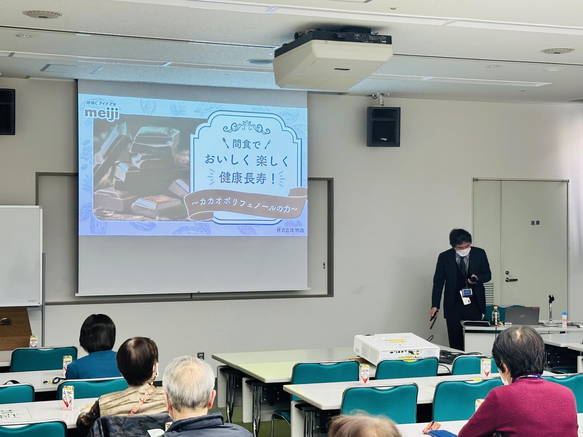 第16回目の講師は、株式会社明治の田中様をお迎えし、「カラダは食べた物からできている」というテーマで講義をしていただきました。講座では、健康上の問題で日常生活が制限されることなく生活するために「栄養・運動・口腔ケア」といった健康寿命を延ばすための実例を交えて学びました。