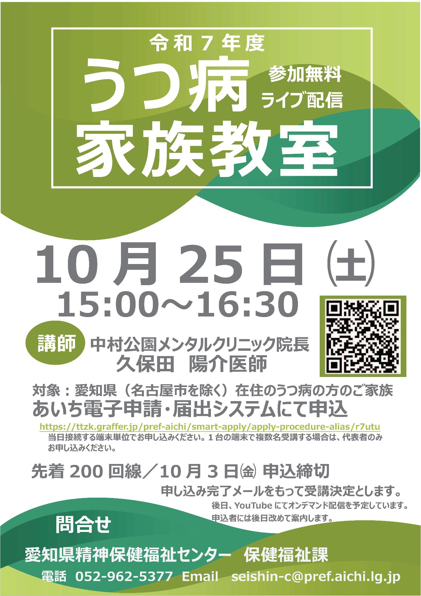 愛知県精神保健福祉センター 令和7年度うつ病家族教室(参加無料、ライブ配信)