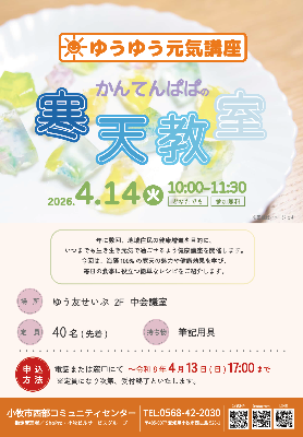 地域のみなさんの健康増進を目的に、いつまでも生き生き元気に過ごせるよう、年に数回健康講座を開催します。今回は、海藻100%のヘルシー食材「寒天」の魅力に迫ります。お気軽にご参加ください。 講師:かんてんぱぱ |