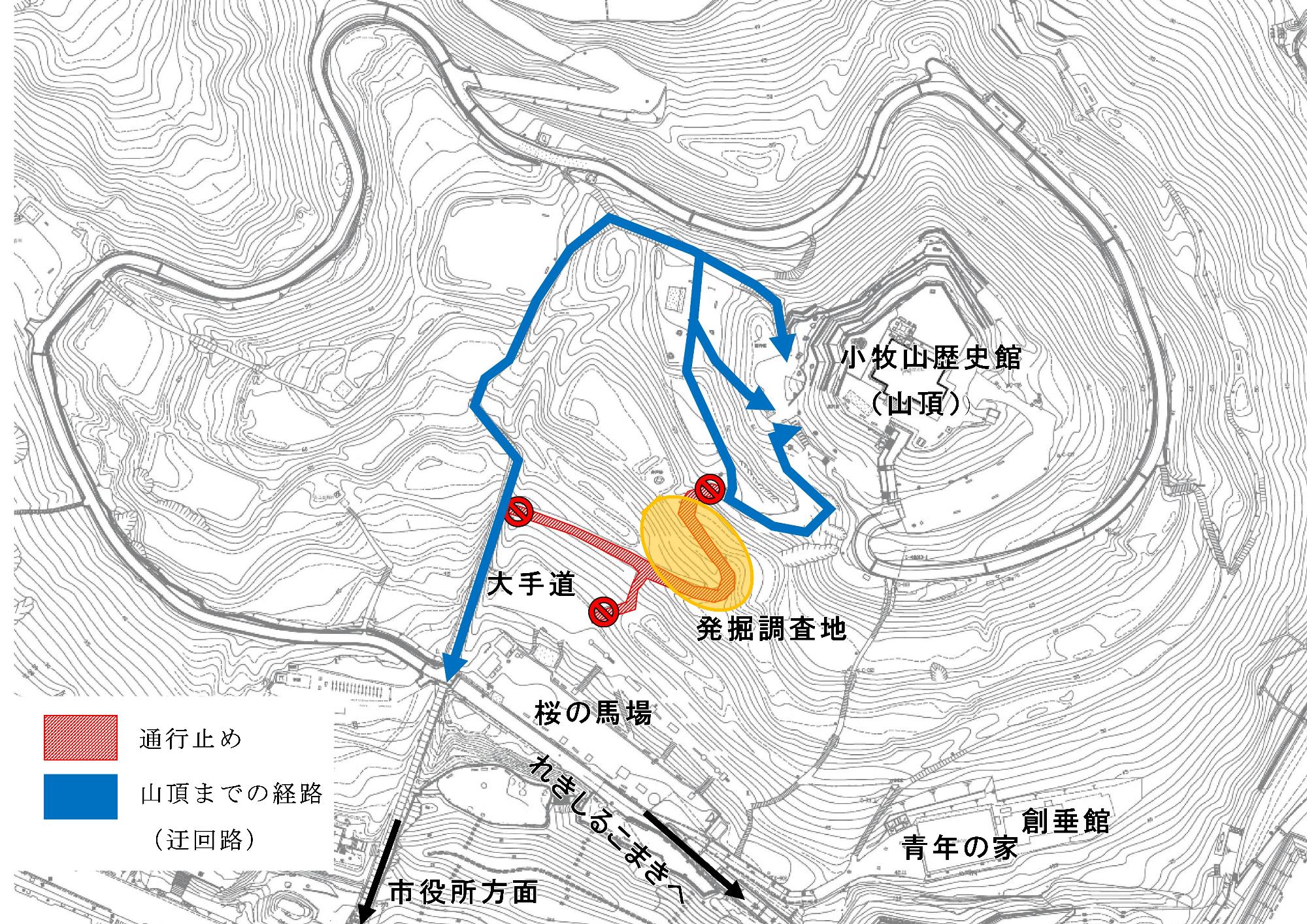 発掘調査に伴い下記の期間において、図面のとおり通行規制を行っていますので、山頂までは迂回路をご利用ください。