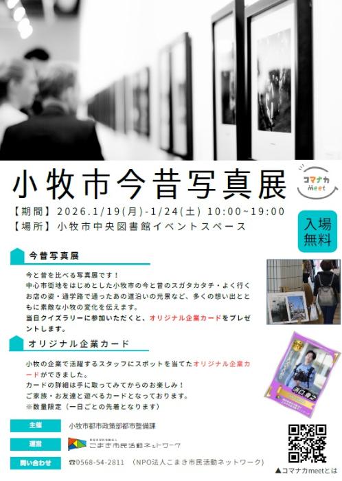 中心市街地活性化プロジェクト「コマナカmeet2025」の取組の一つである「小牧市今昔写真展」を1月19日(月曜日)~1月24日(土曜日)に小牧市中央図書館イベントスペースにて開催します。